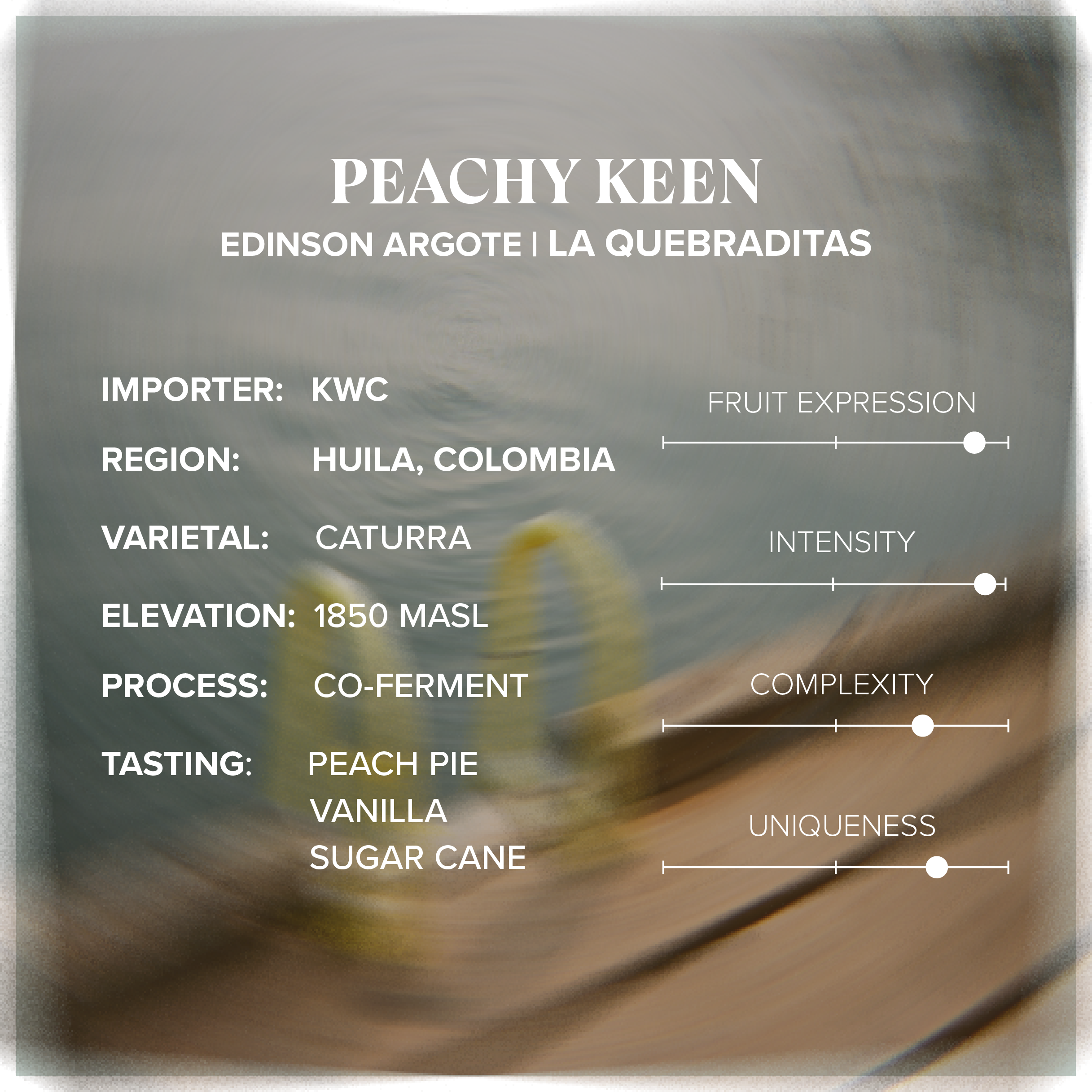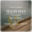 This unique lot showcases Edinson’s experimental approach, a Peach Co-Ferment where ripe coffee cherries are combined with fresh peaches during fermentation. The result is a beautiful harmony of fruit expression and terroir, crafted with precision from start to finish.